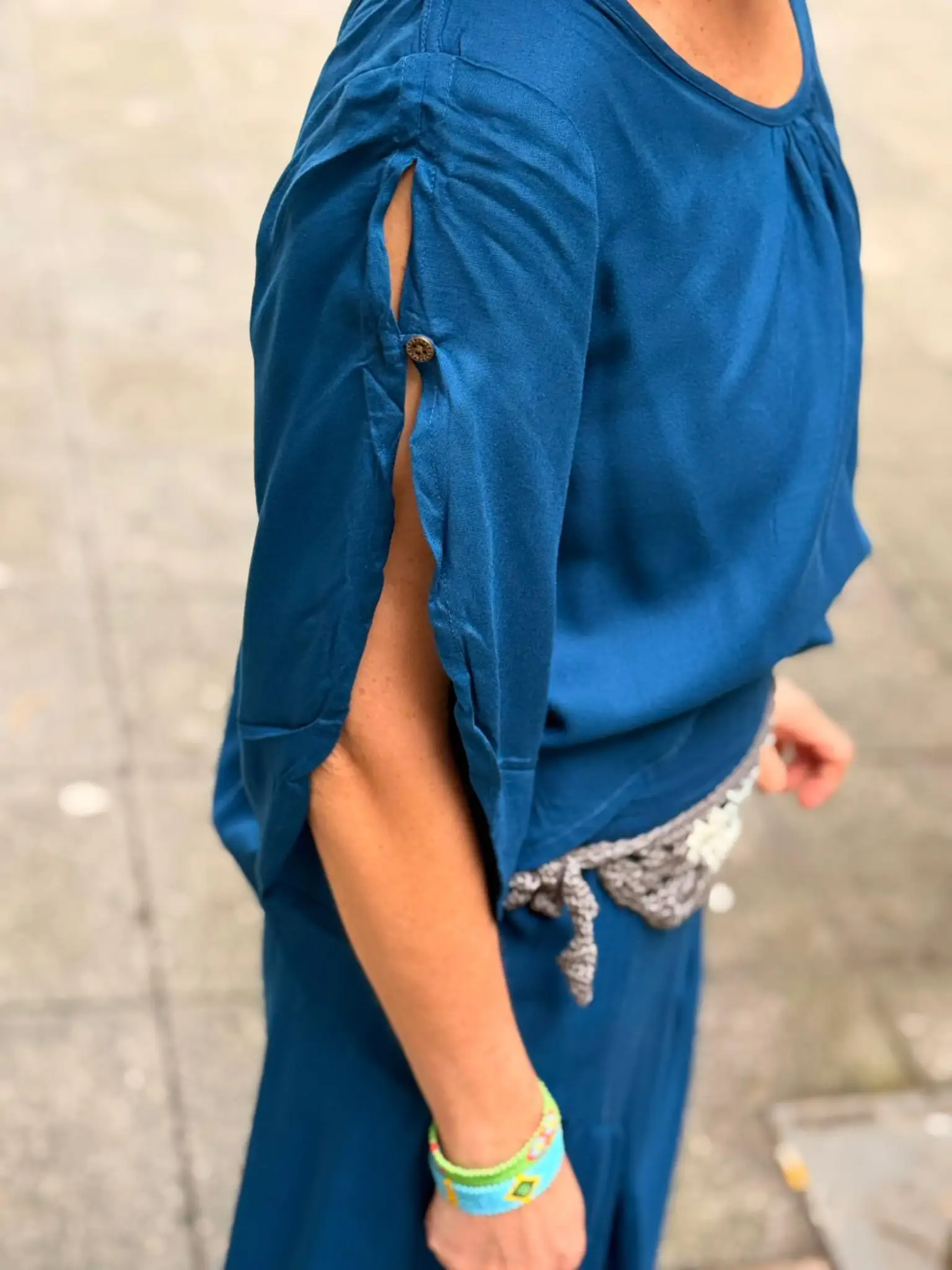 Con manga francesa abierta desde el hombro (y botón para cerrarla cuando tú quieras), juega con las formas y deja ver la piel de una manera súper bonita. Escotada por delante y por detrás, es de esas prendas que tienen ese aire delicado pero con personalidad