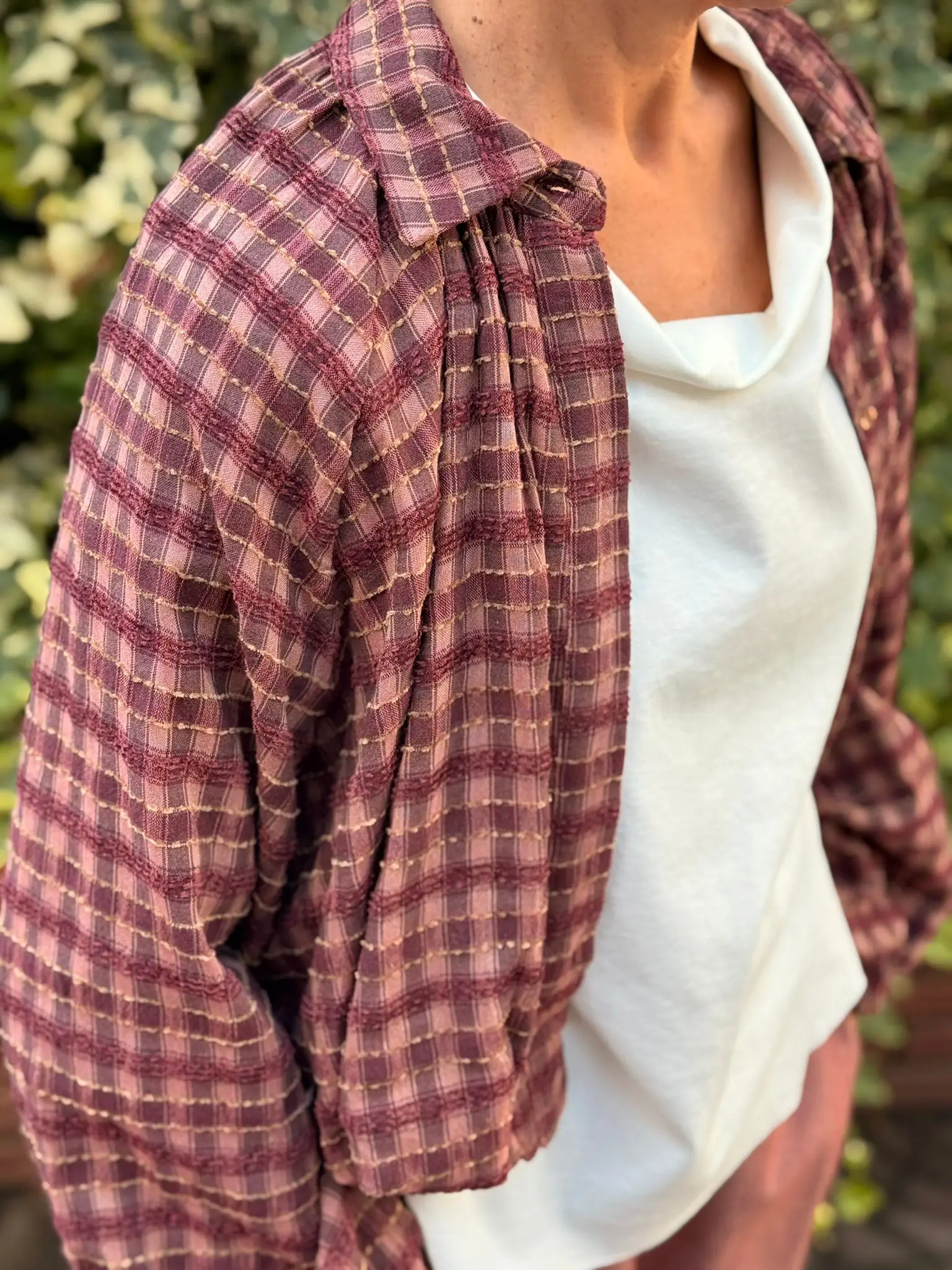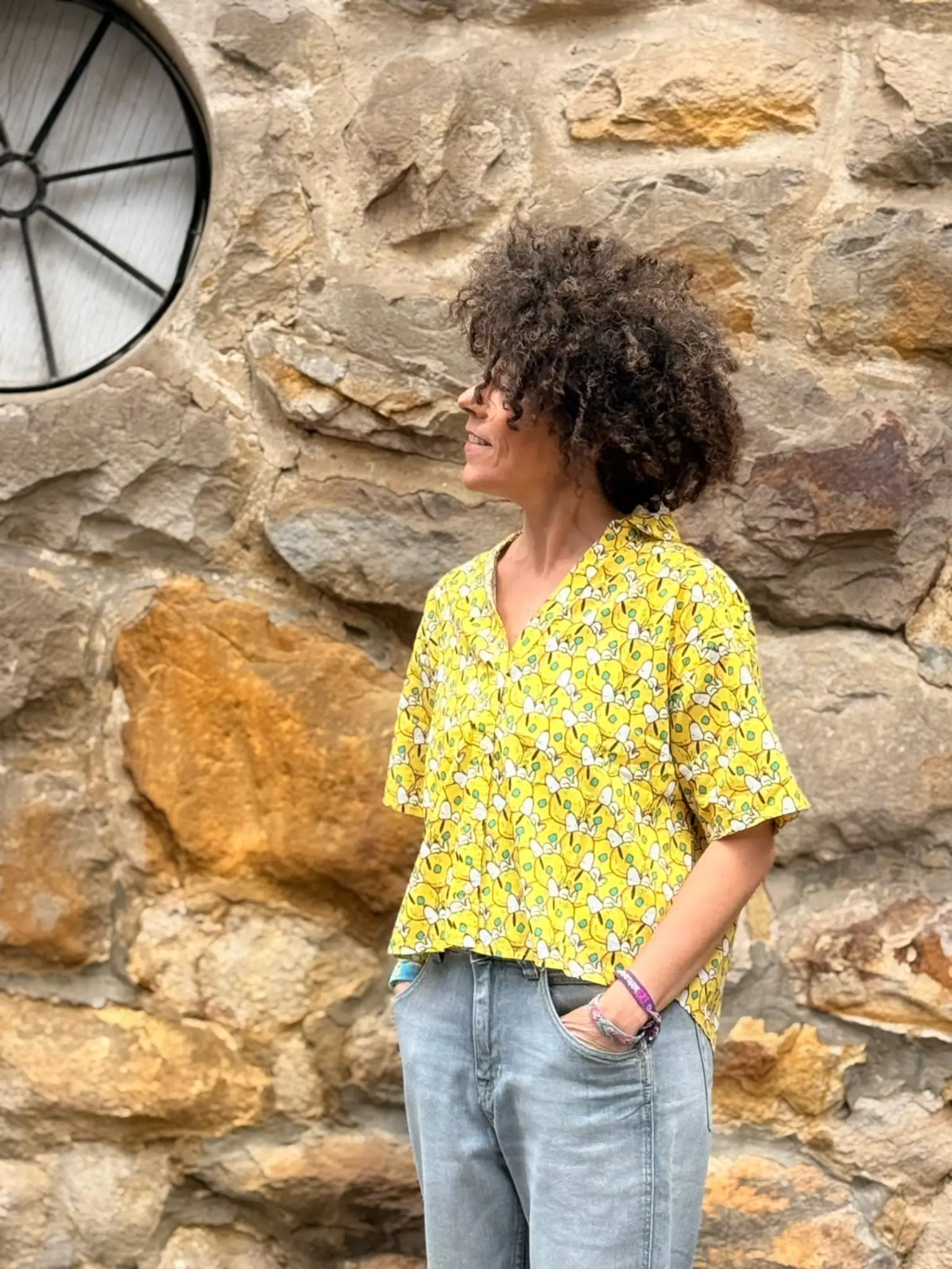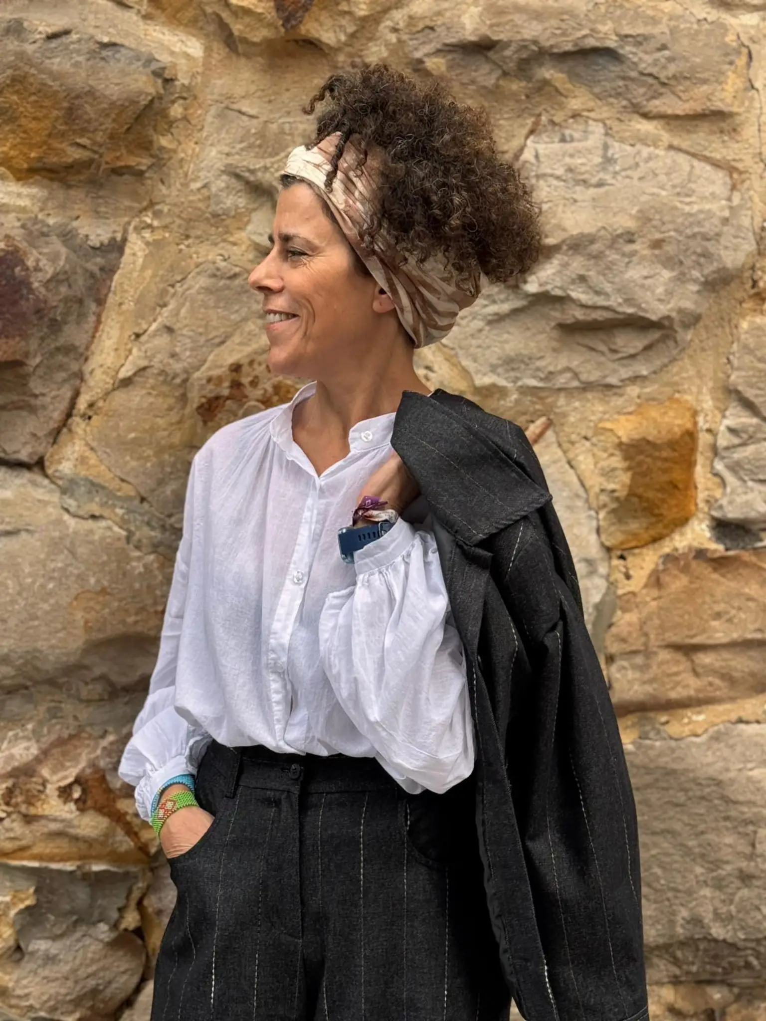 Camisa de corte irregular, más larga en los laterales para crear unos picos suaves con movimiento, que aportan un toque muy especial a un básico de siempre. Lleva cuello camisero, manga larga y botonadura al tono, manteniendo una línea limpia y elegante.