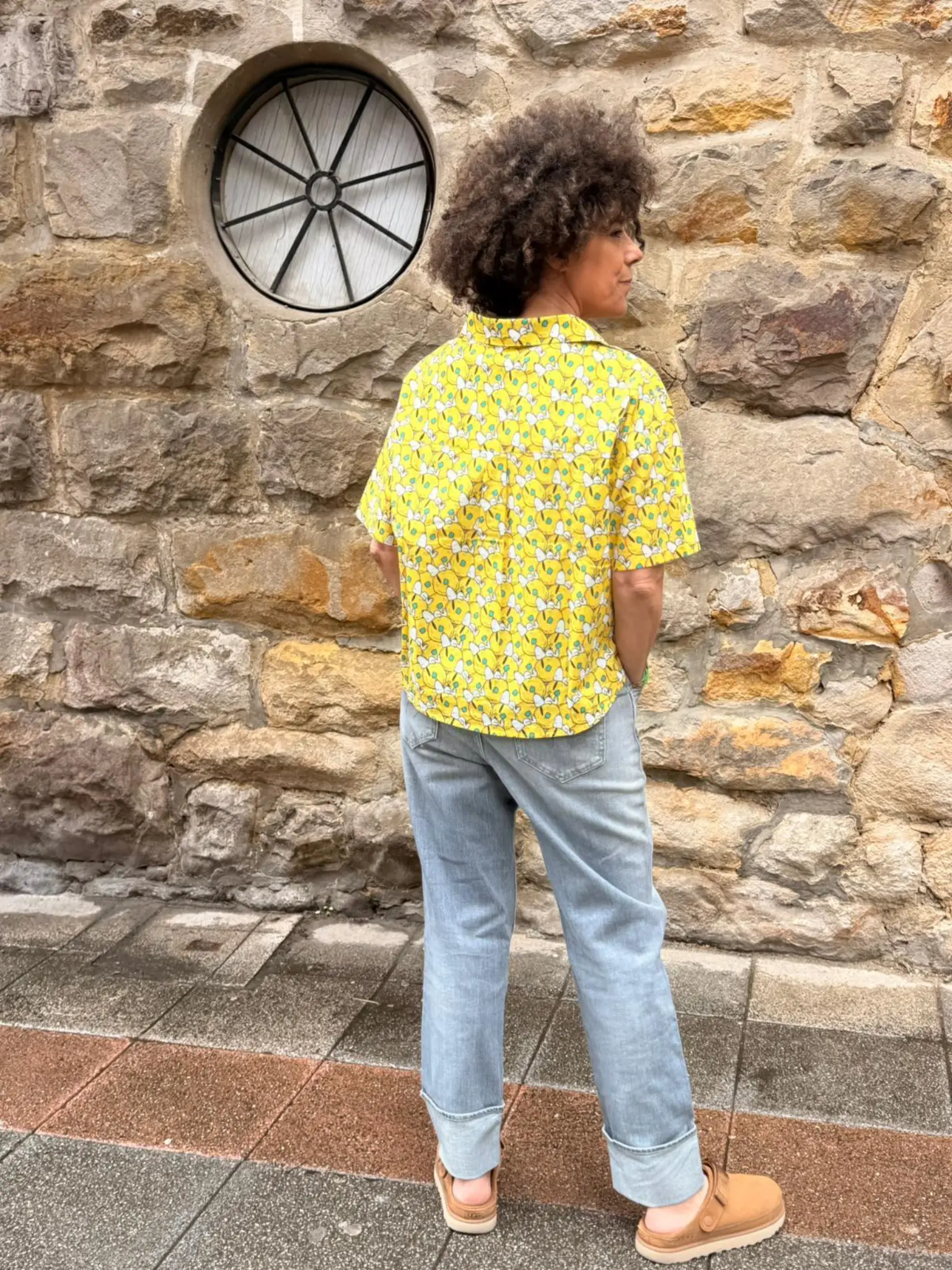 Con manga corta, cuello camisero y escote en pico, tiene ese aire fresco y favorecedor que apetece llevar sin parar. Su estructura ancha y cortita le da un rollo desenfadado que sienta genial