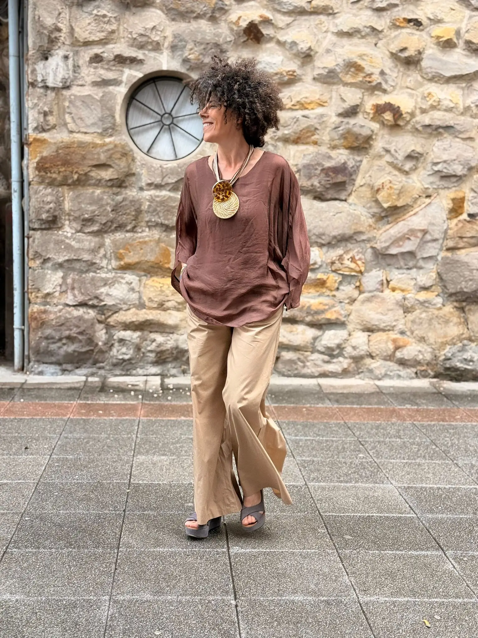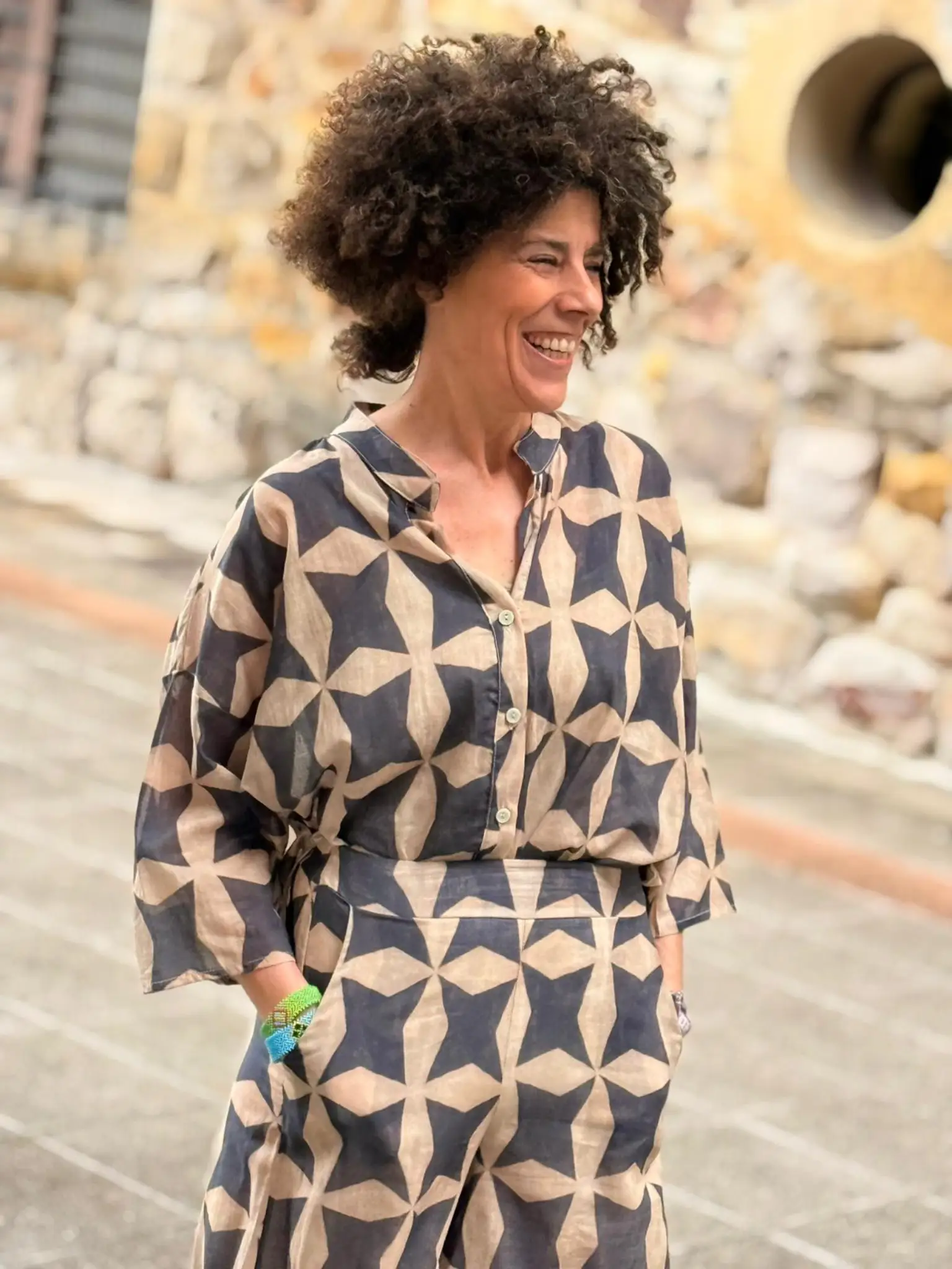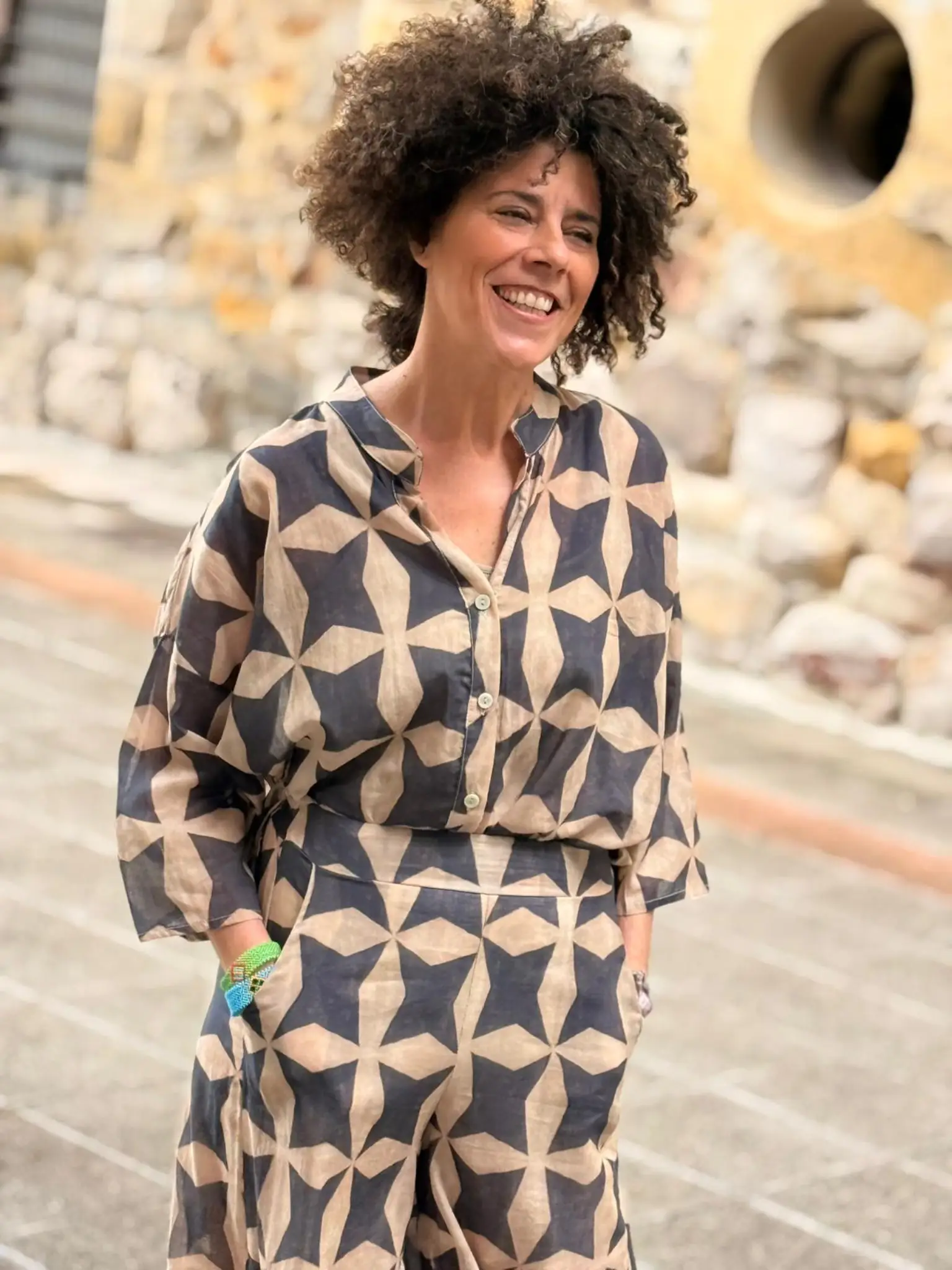 Con cuello mao, escote en pico y botonadura completa, tiene ese equilibrio perfecto entre relajada y arreglada que funciona siempre. La manga francesa le da un aire actual y muy favorecedor, ideal para cualquier plan