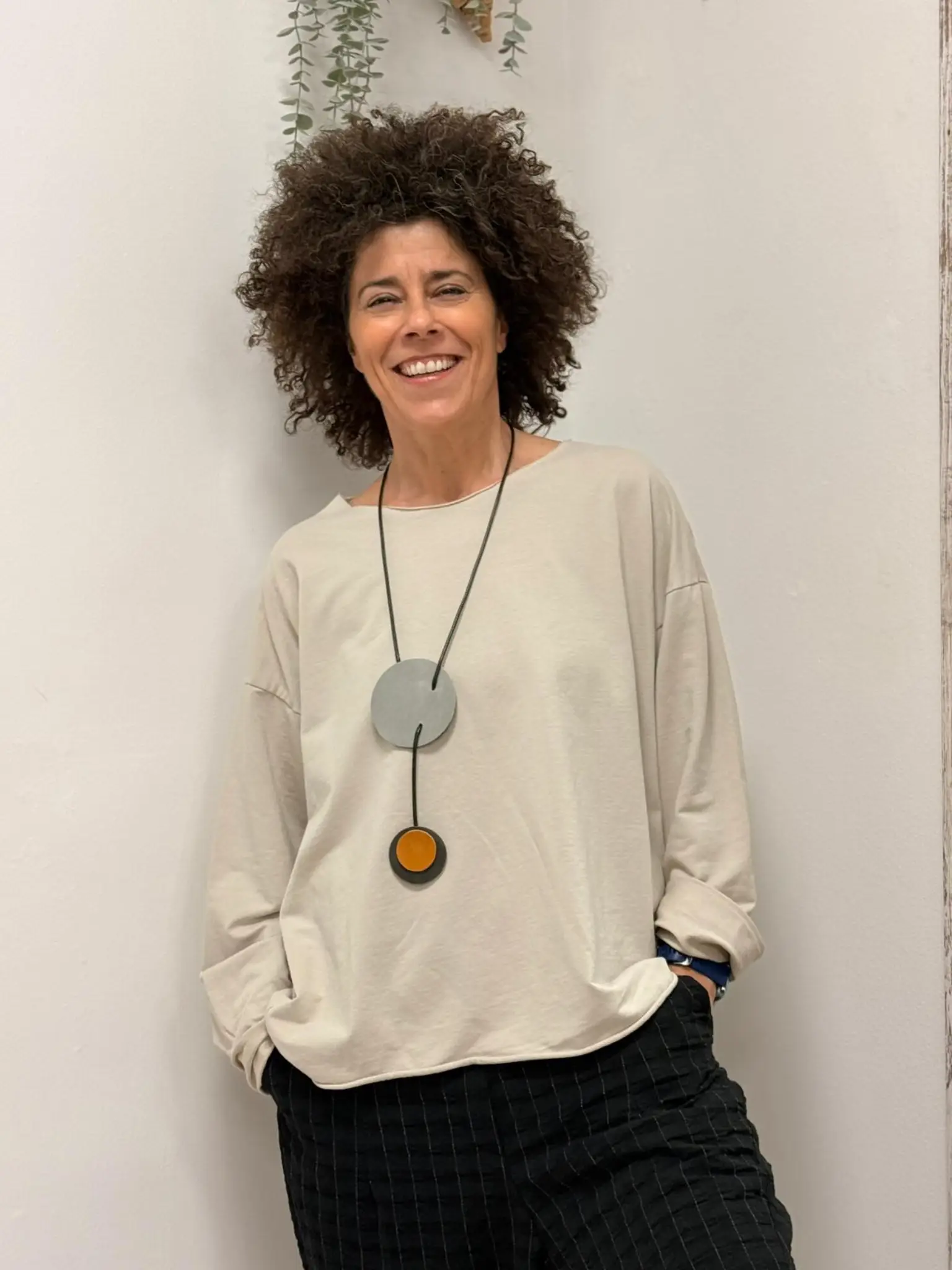 Camiseta de algodón perfecta para llevar también como sudadera ligera. De escote redondo y manga larga, es una prenda cómoda, versátil y muy fácil de combinar en el día a día.