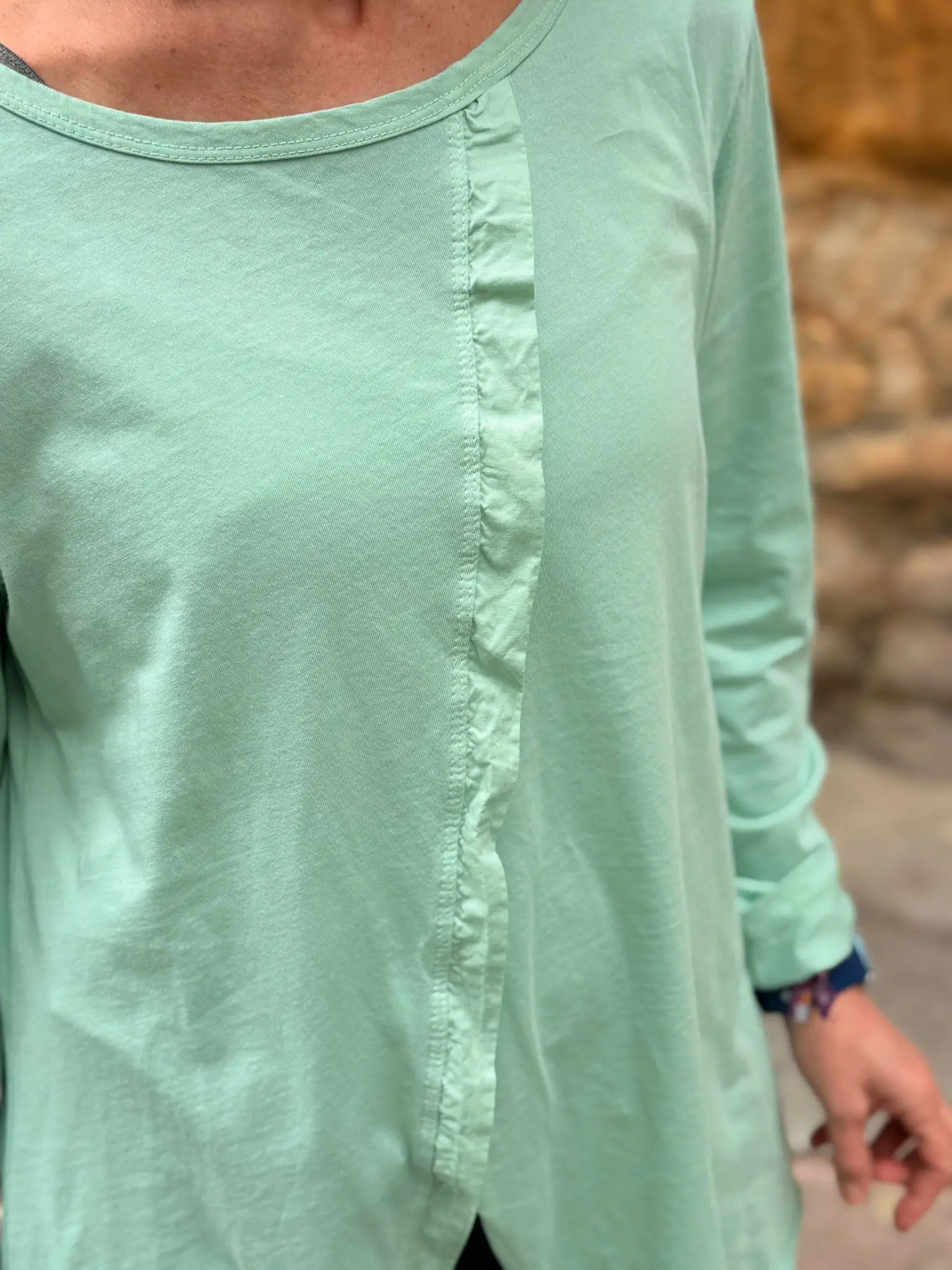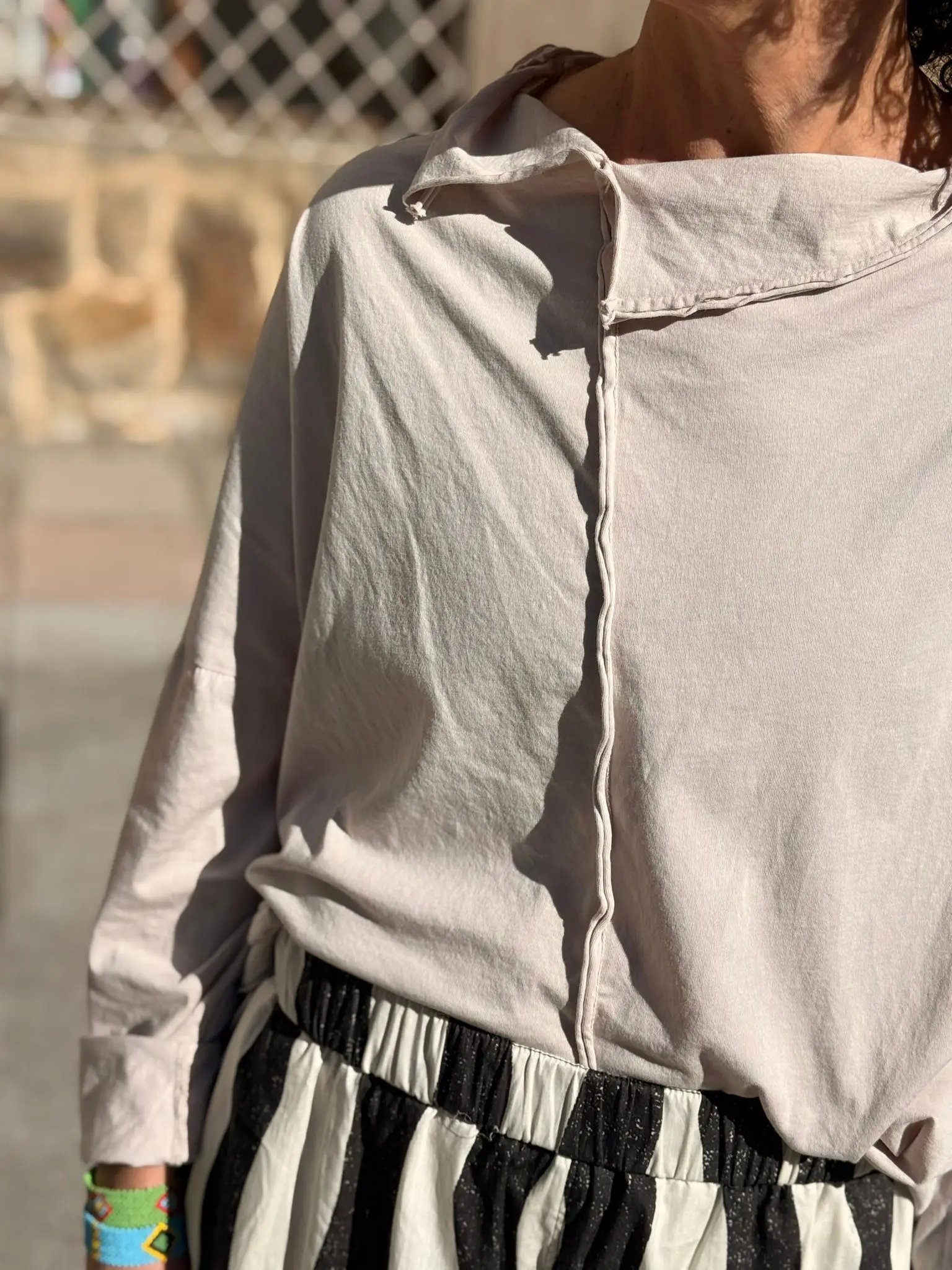 Camiseta de escote redondo y manga larga, de esas que te solucionan el look sin pensar demasiado. Lleva una pequeña pinza en la parte trasera que le da caída y movimiento, y un corte ligeramente irregular, siendo un poquito más larga por detrás que por delante (porque esos detalles importan ).
