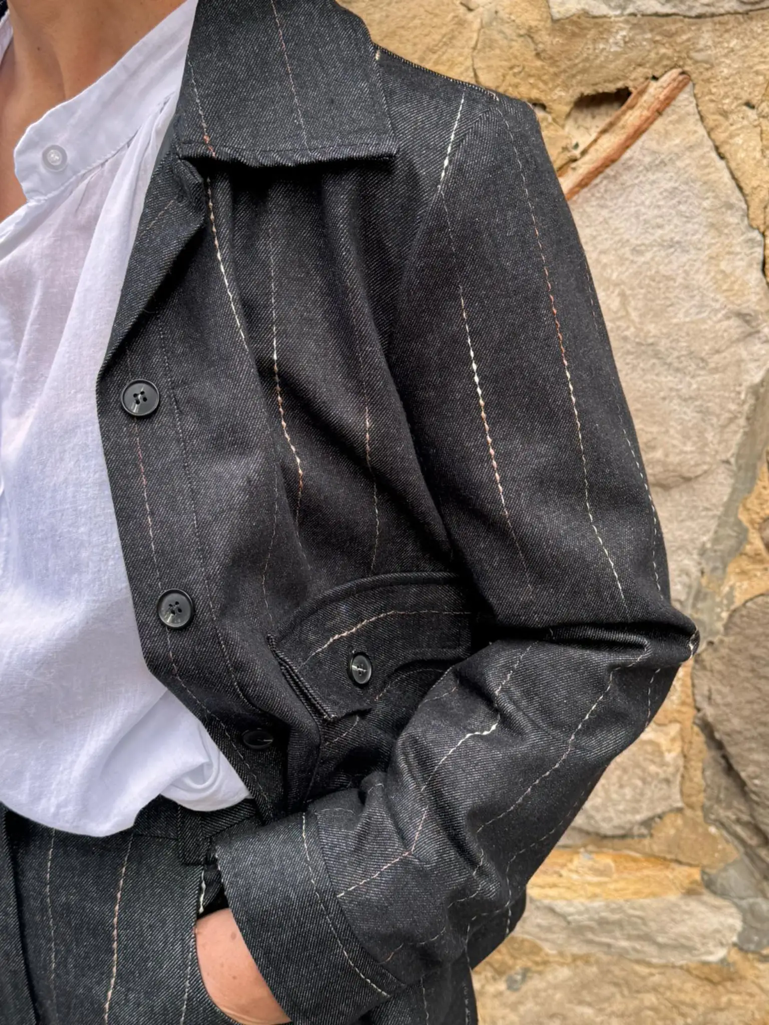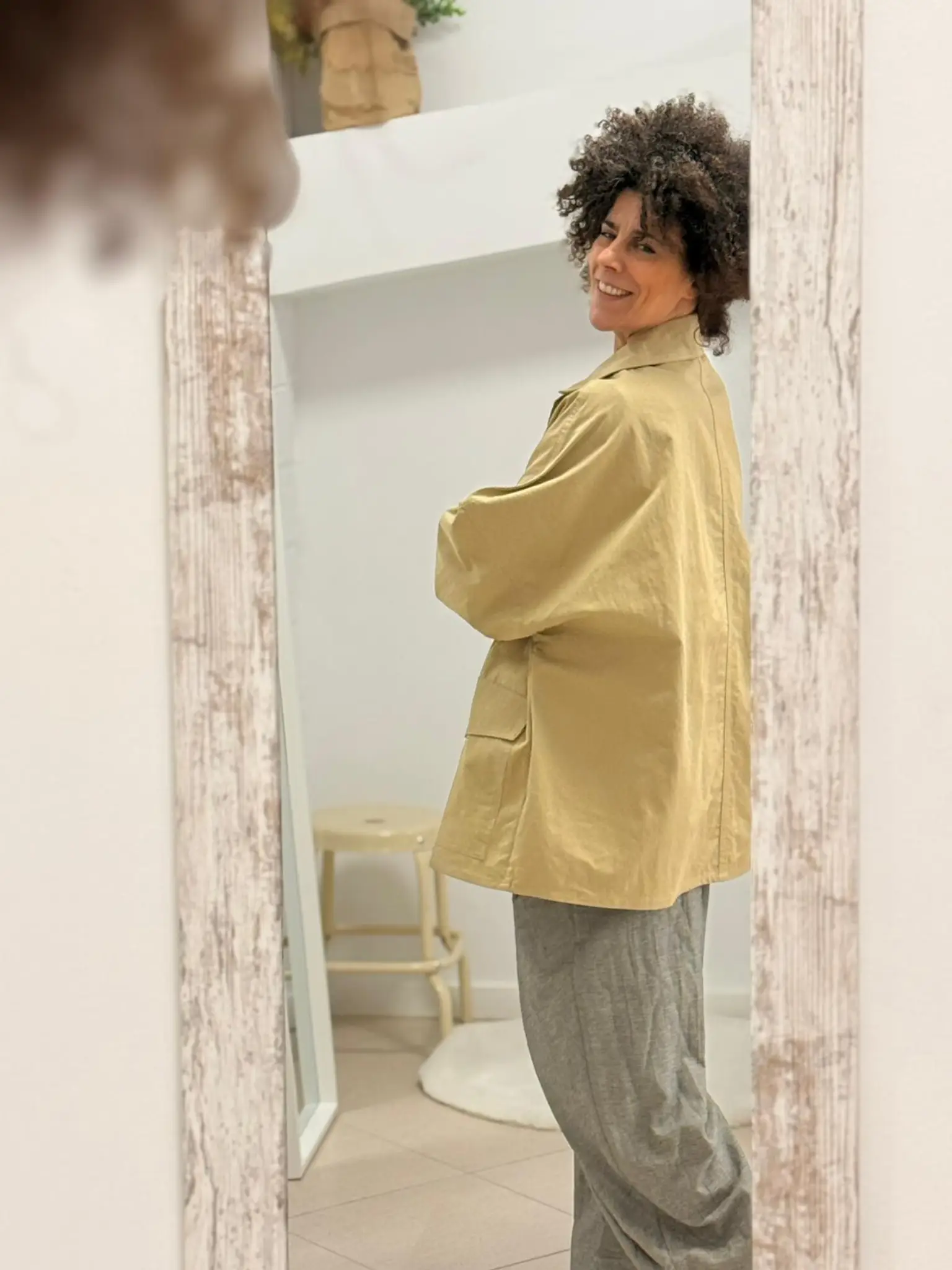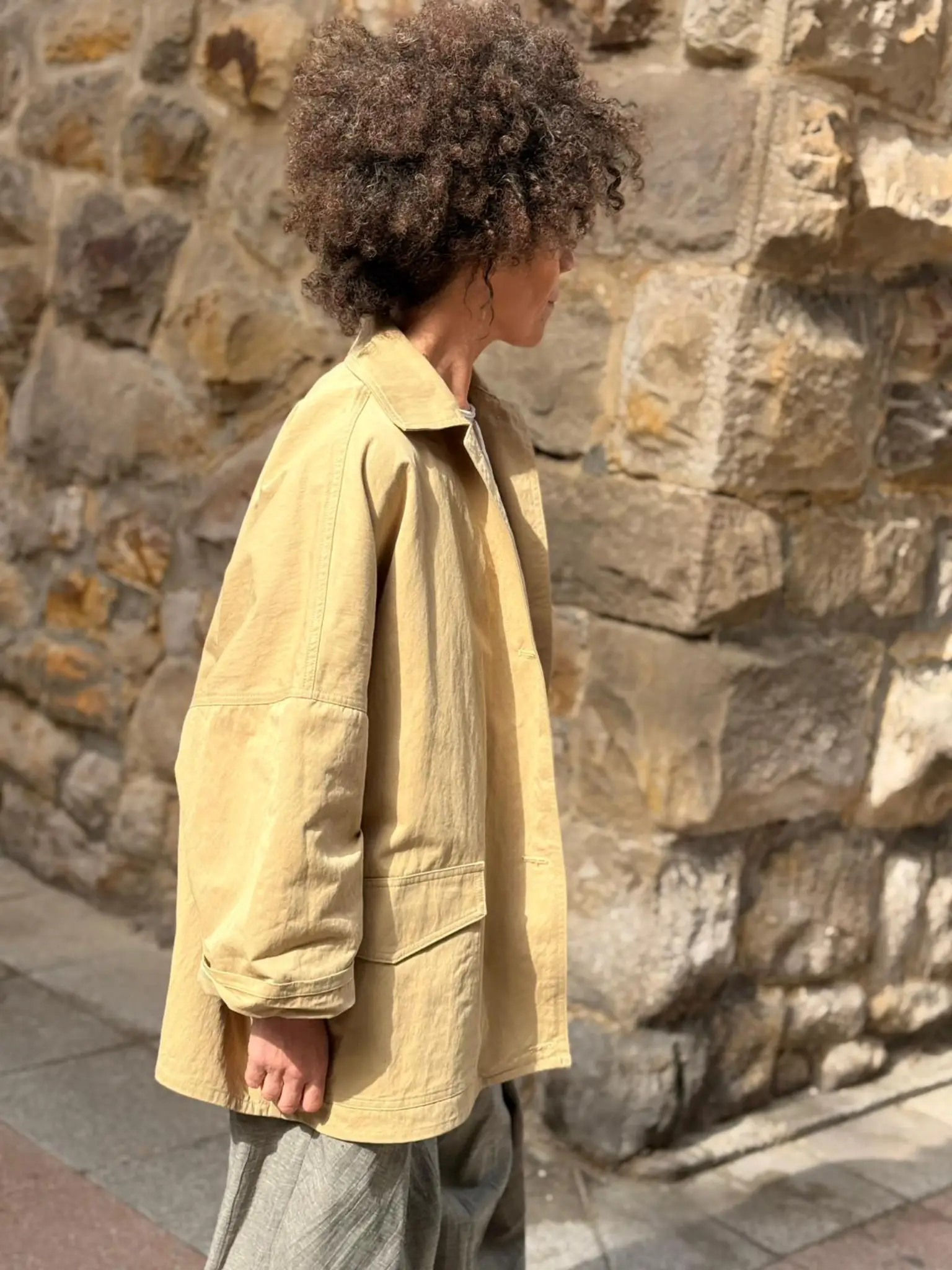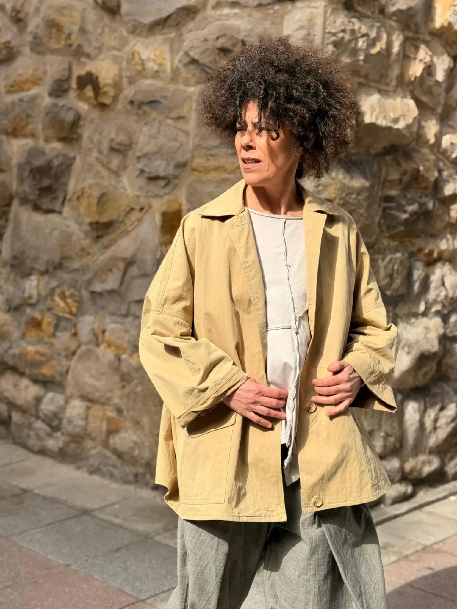 Chaqueta de corte amplio confeccionada en resistente loneta, perfecta para los días de entretiempo. Presenta cuello camisero y cierre con botones al tono, que aportan un acabado limpio y fácil de combinar.