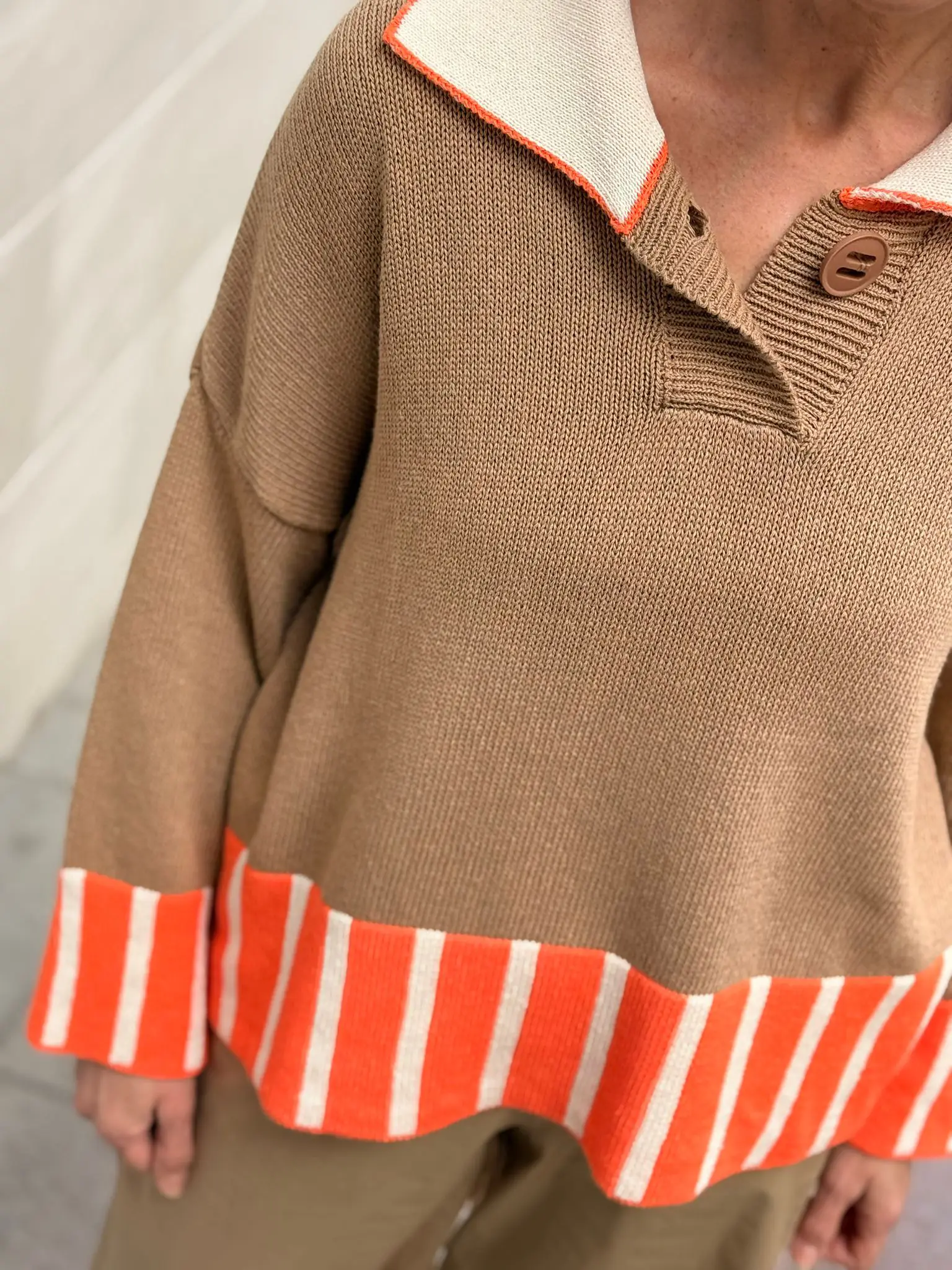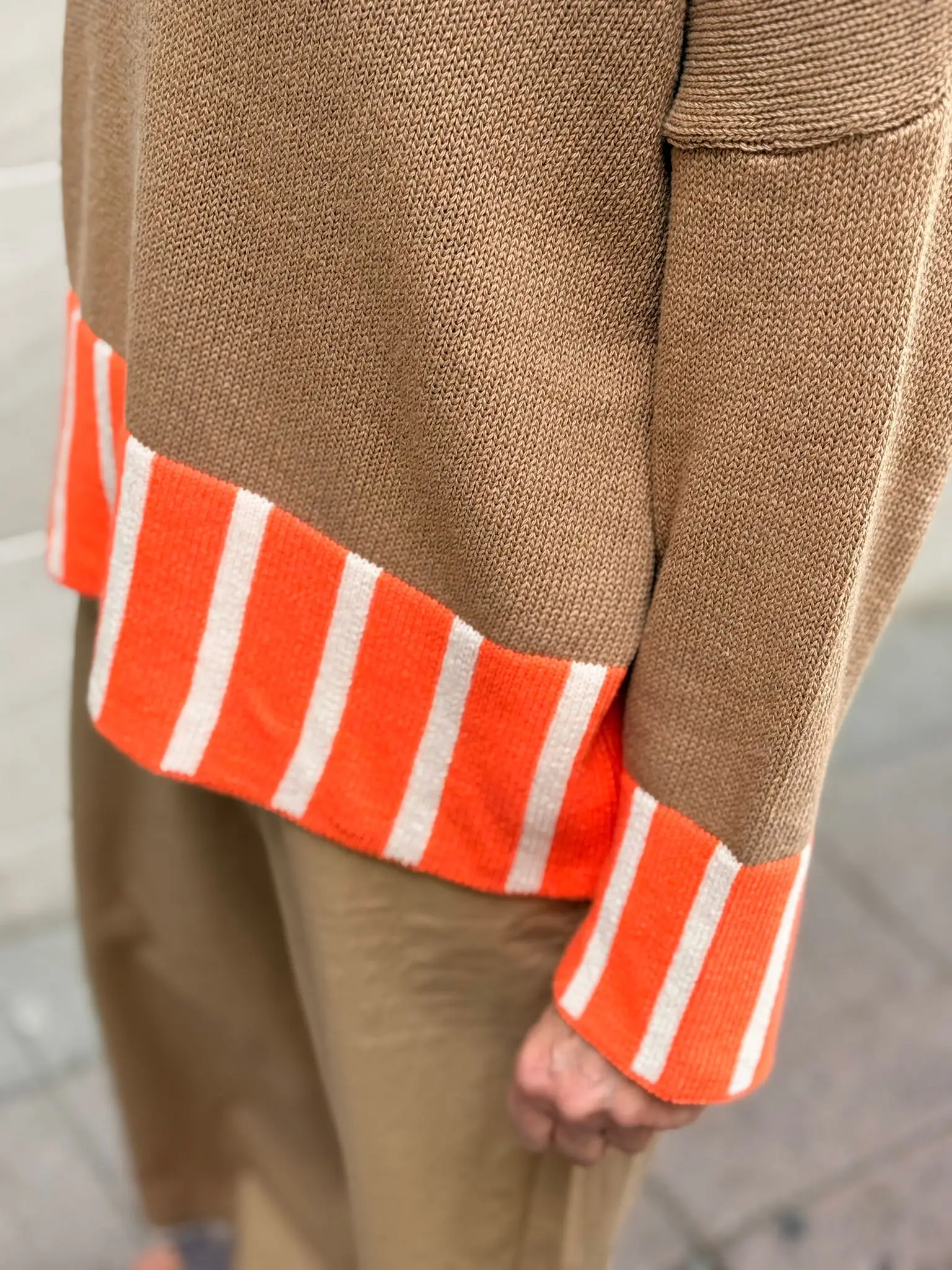 Pero aquí lo mejor viene en los detalles: cuello, mangas y cenefa a rayas en contraste, creando ese juego visual tan especial que convierte este jersey en algo más que un básico