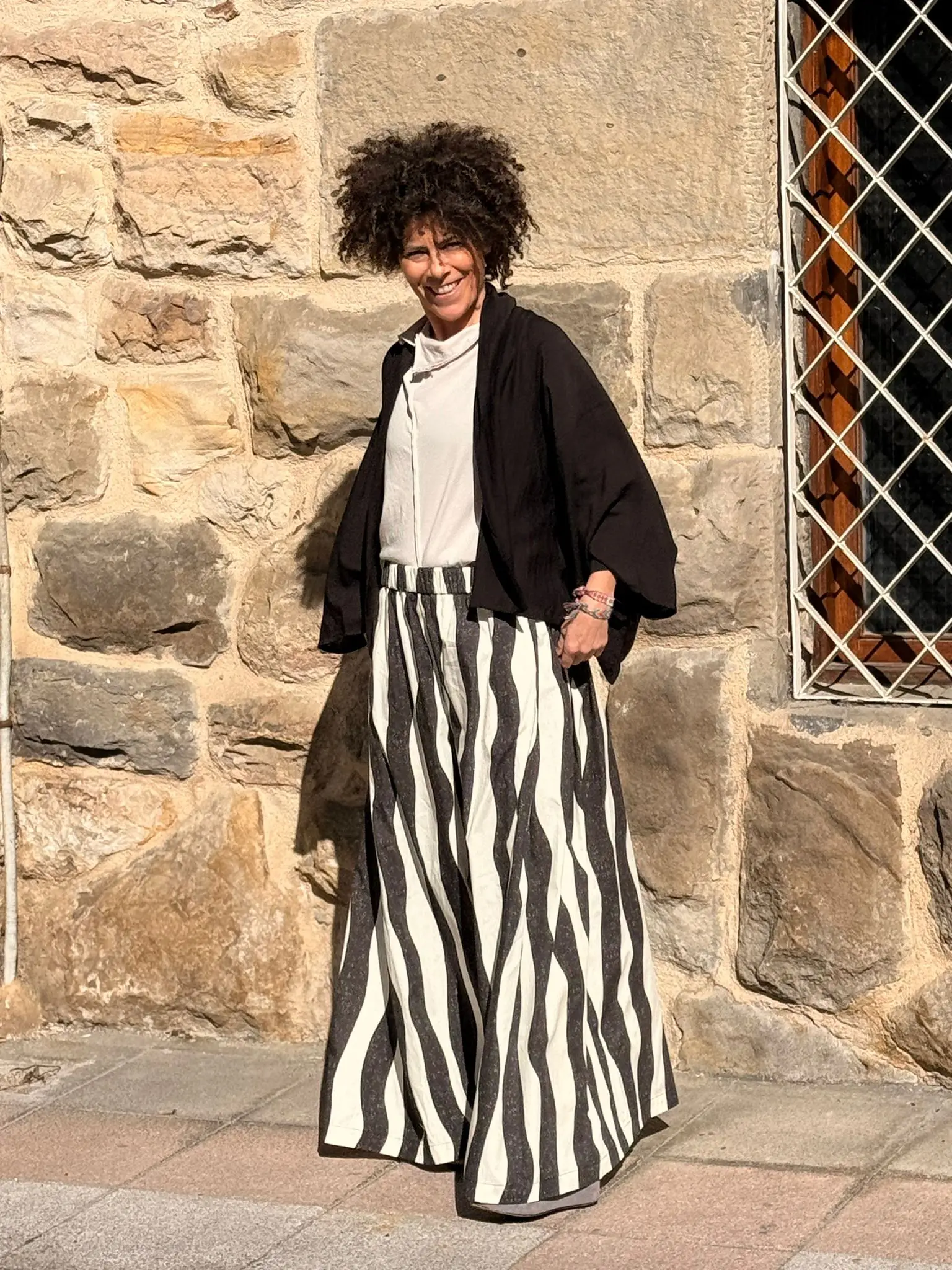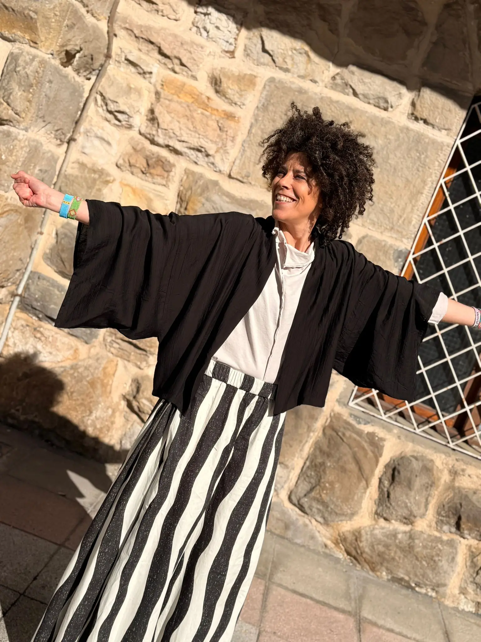 Kimono corto en color negro, con una manga amplia y cuadrada. De estructura amplia, la tela hace un ligero arrugado y elcuello es tipo pañuelo.
