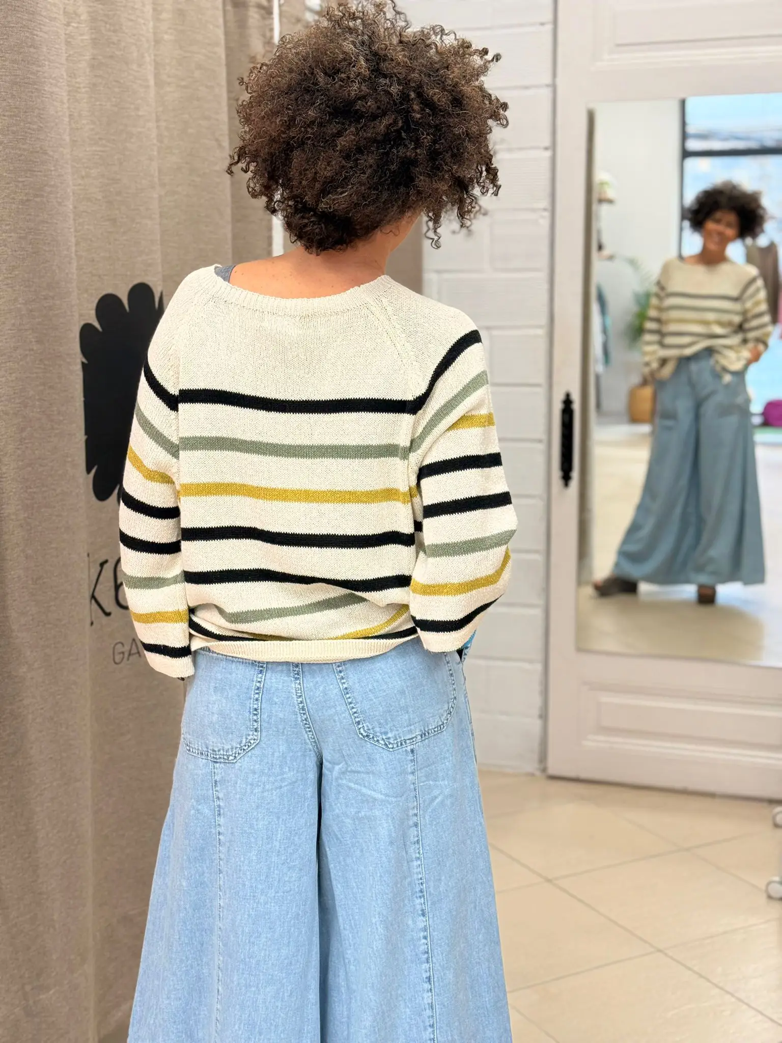 Destaca por sus bolsillos delanteros cuadrados tipo plastrón, que aportan un aire actual y funcional. Se ajusta en la zona de la cintura y cadera, y a partir de ahí la pernera se ensancha progresivamente, creando una silueta amplia con mucho movimiento.