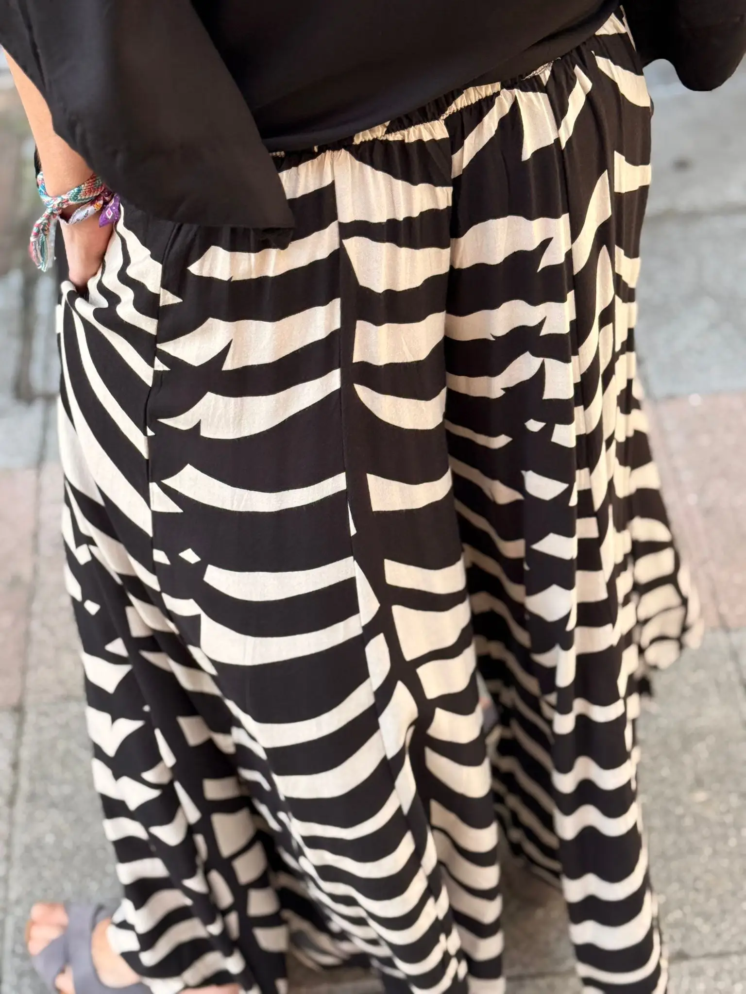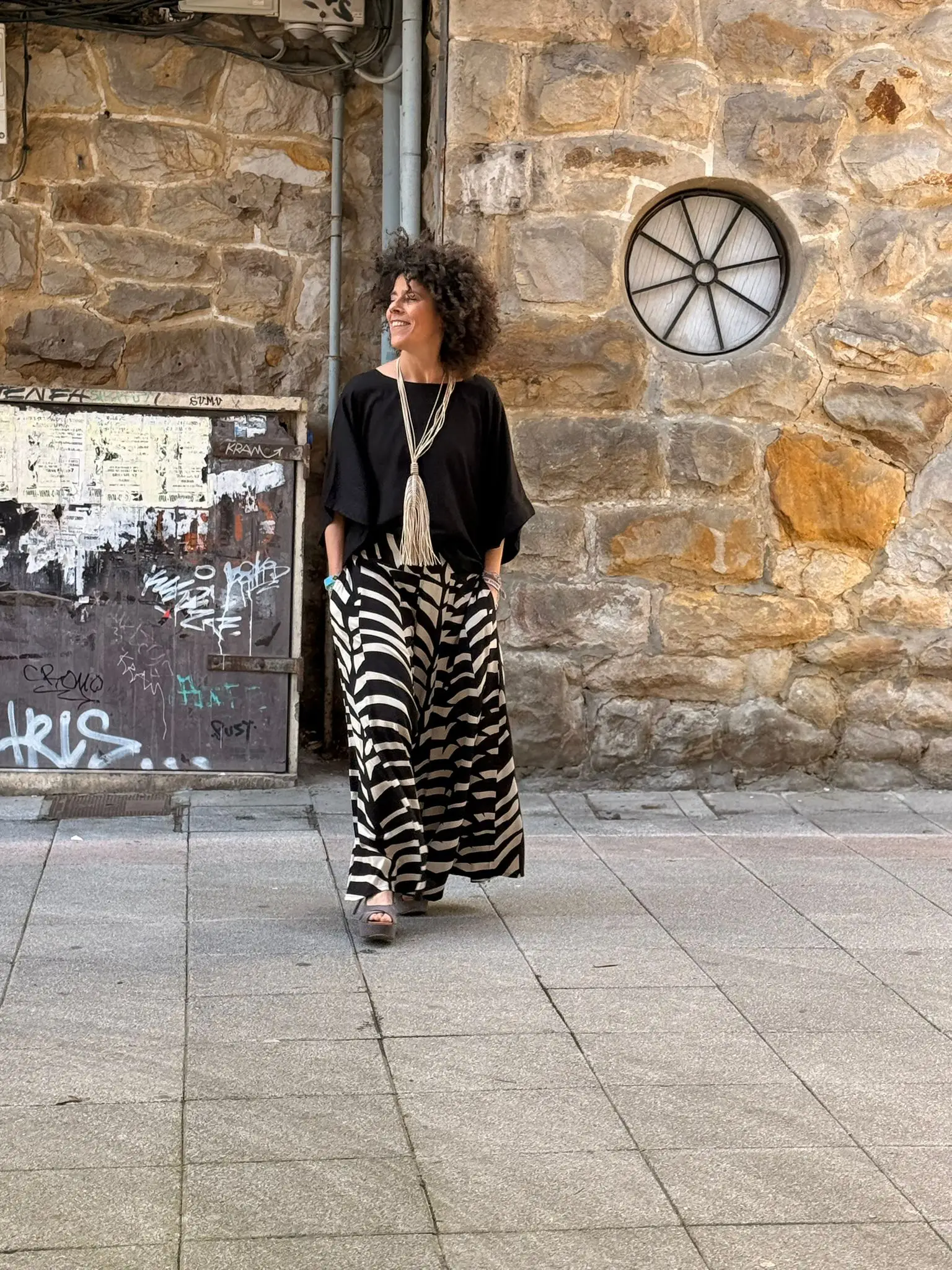 Pantalón fluido en combinación beige y negro, con un diseño elegante y muy favorecedor. Presenta cintura mixta, lisa en la parte delantera a modo de fajín, que estiliza la figura, y elástica en la parte trasera para mayor comodidad y ajuste.