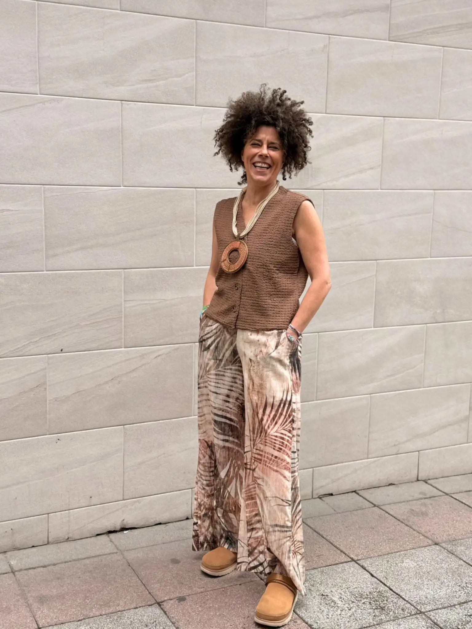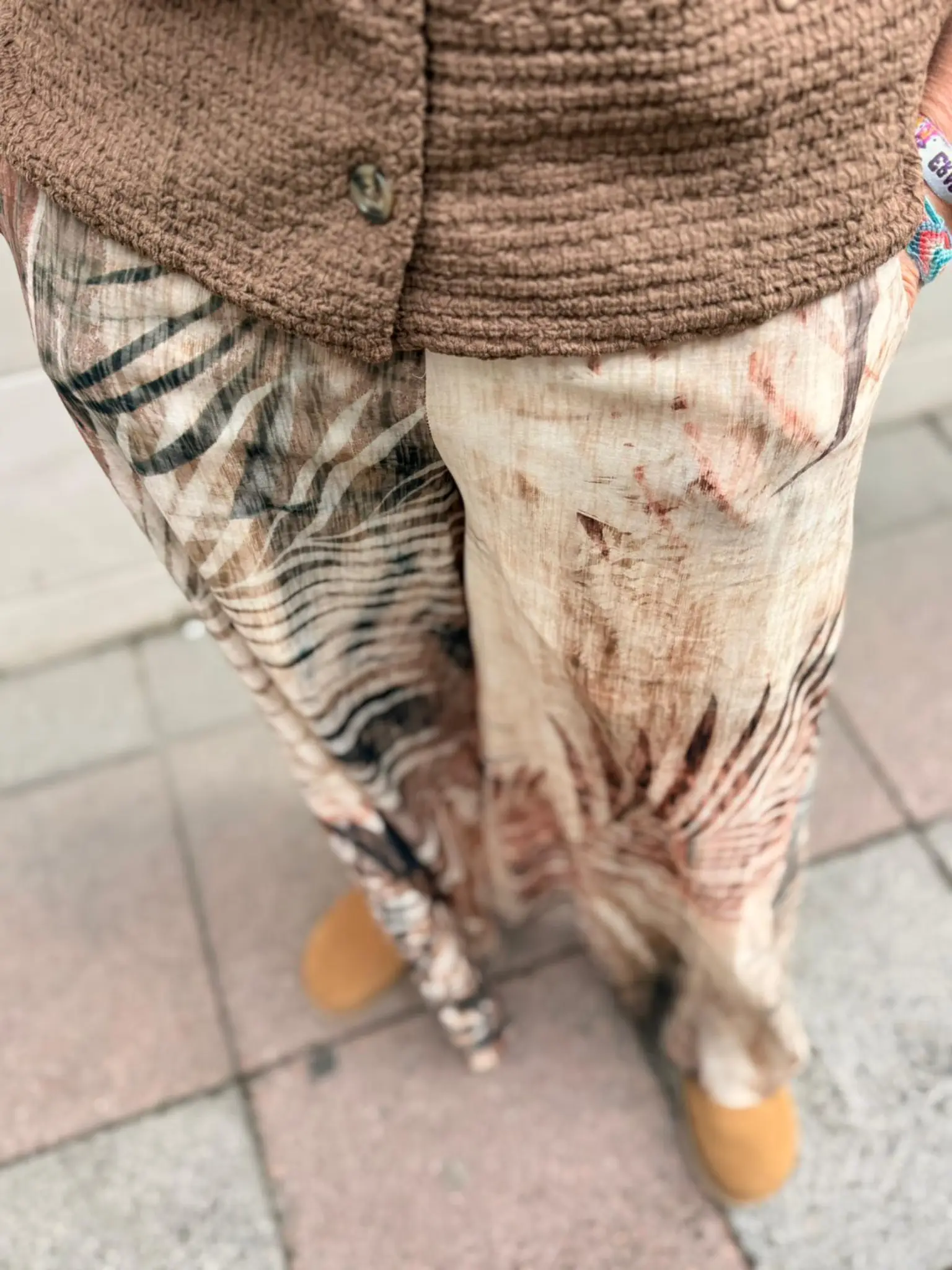 Con un estampado de hojas de palmera en tonos marrones, beige y arena, tiene ese rollo natural y cálido que combina con todo y sienta aún mejor. Su tejido vaporoso se mueve contigo y crea ese efecto tan bonito al caminar