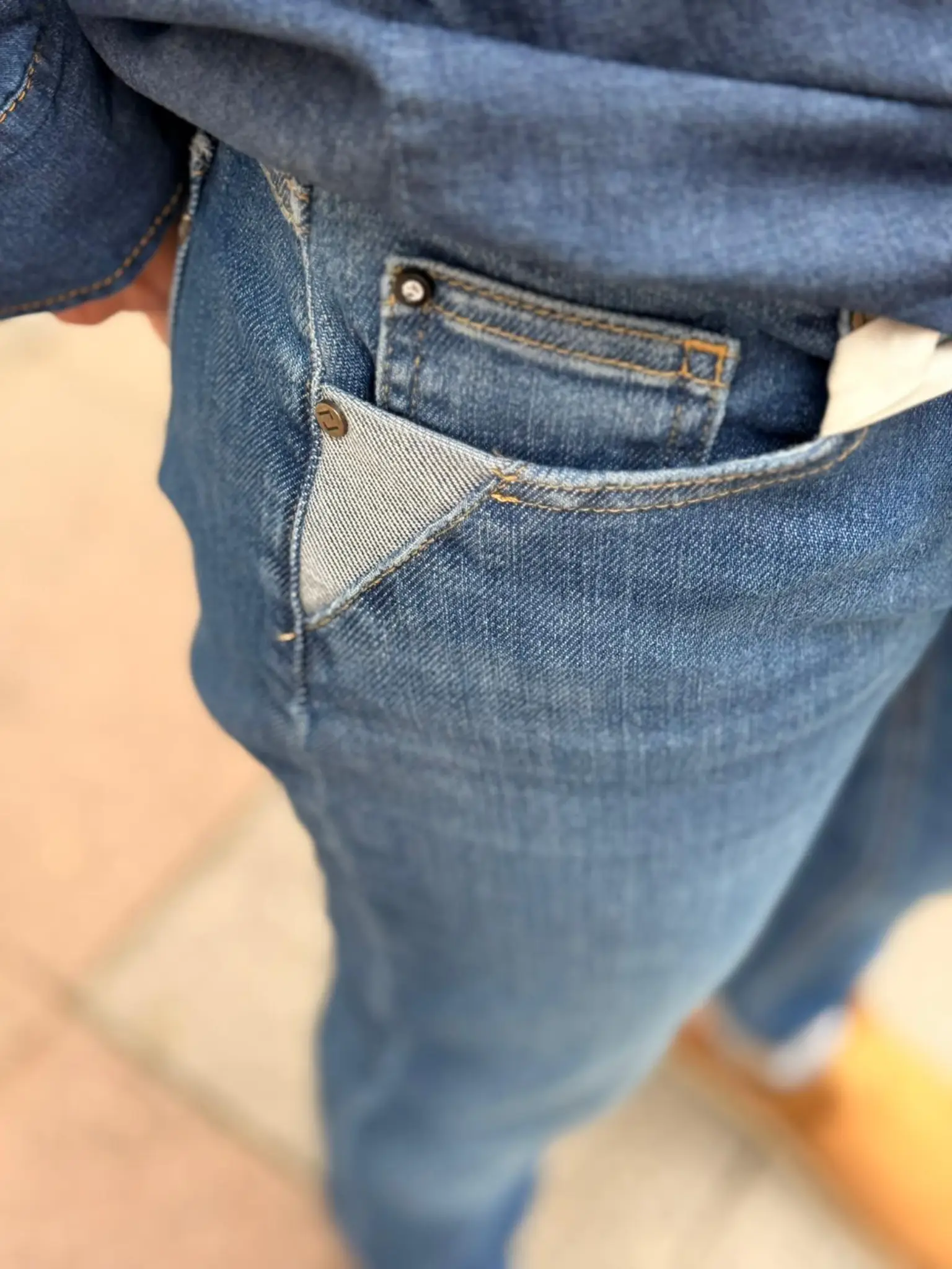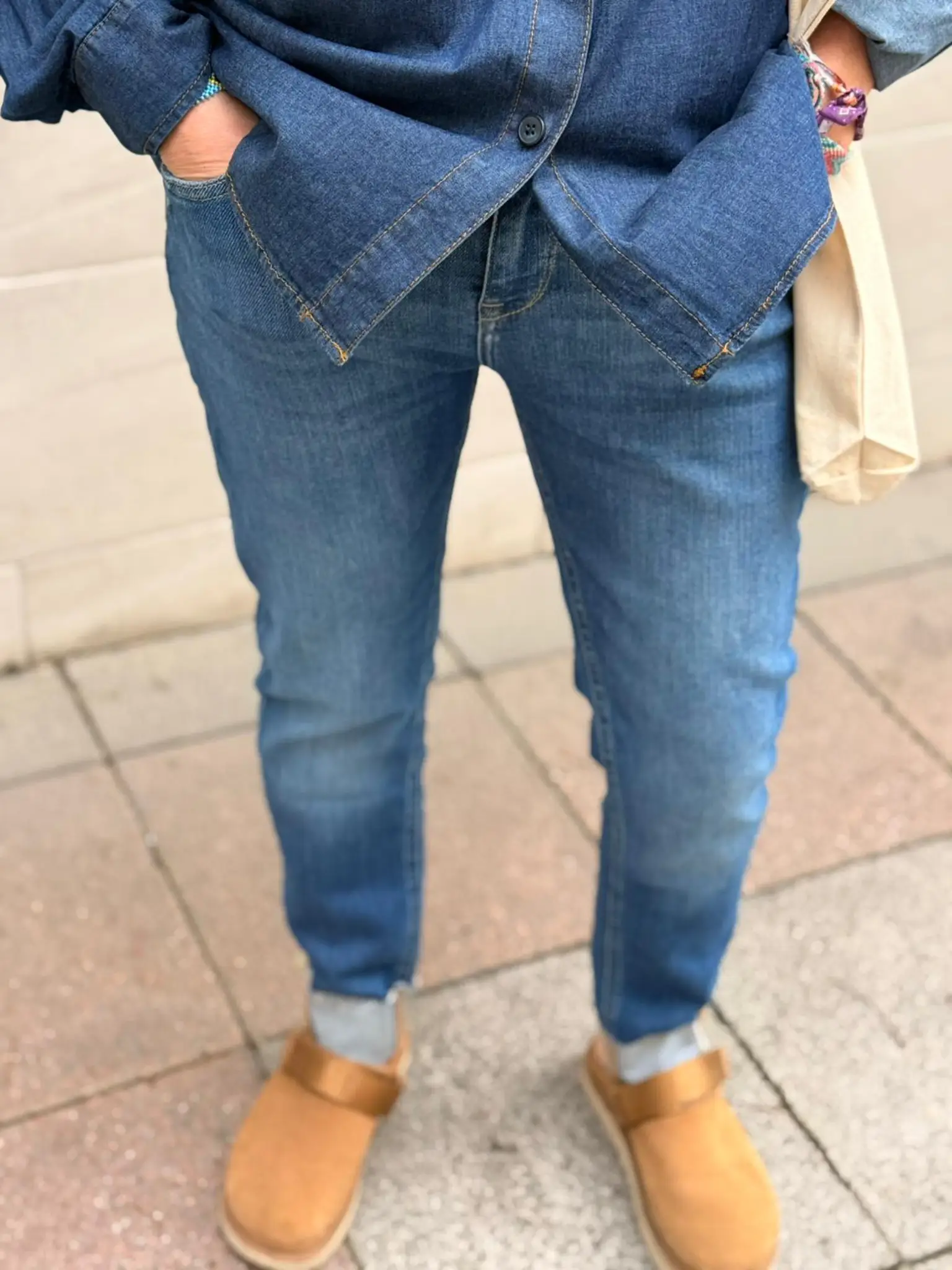 Pantalón vaquero clásico de cinco bolsillos, diseñado con un corte recto que se estrecha ligeramente en la parte inferior para conseguir una silueta actual y favorecedora. Cuenta con cierre de botón y cremallera, manteniendo el estilo tradicional del denim.
