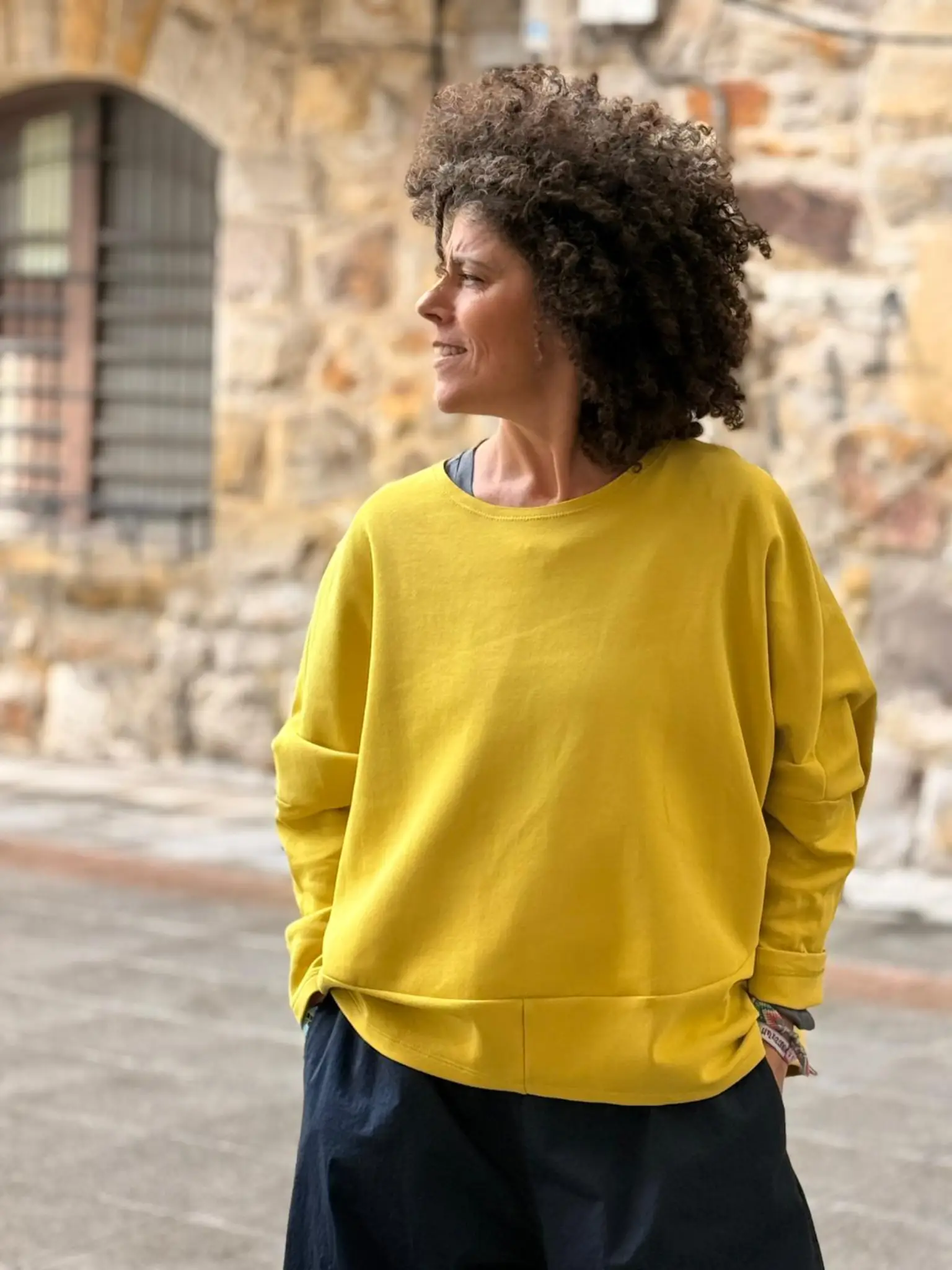 Con manga larga caída y escote redondo, tiene un fit suelto que invita a no quitártela en todo el día. La pieza cosida desde la parte inferior hasta la manga crea ese efecto murciélago tan especial, dándole un aire diferente y con mucha personalidad