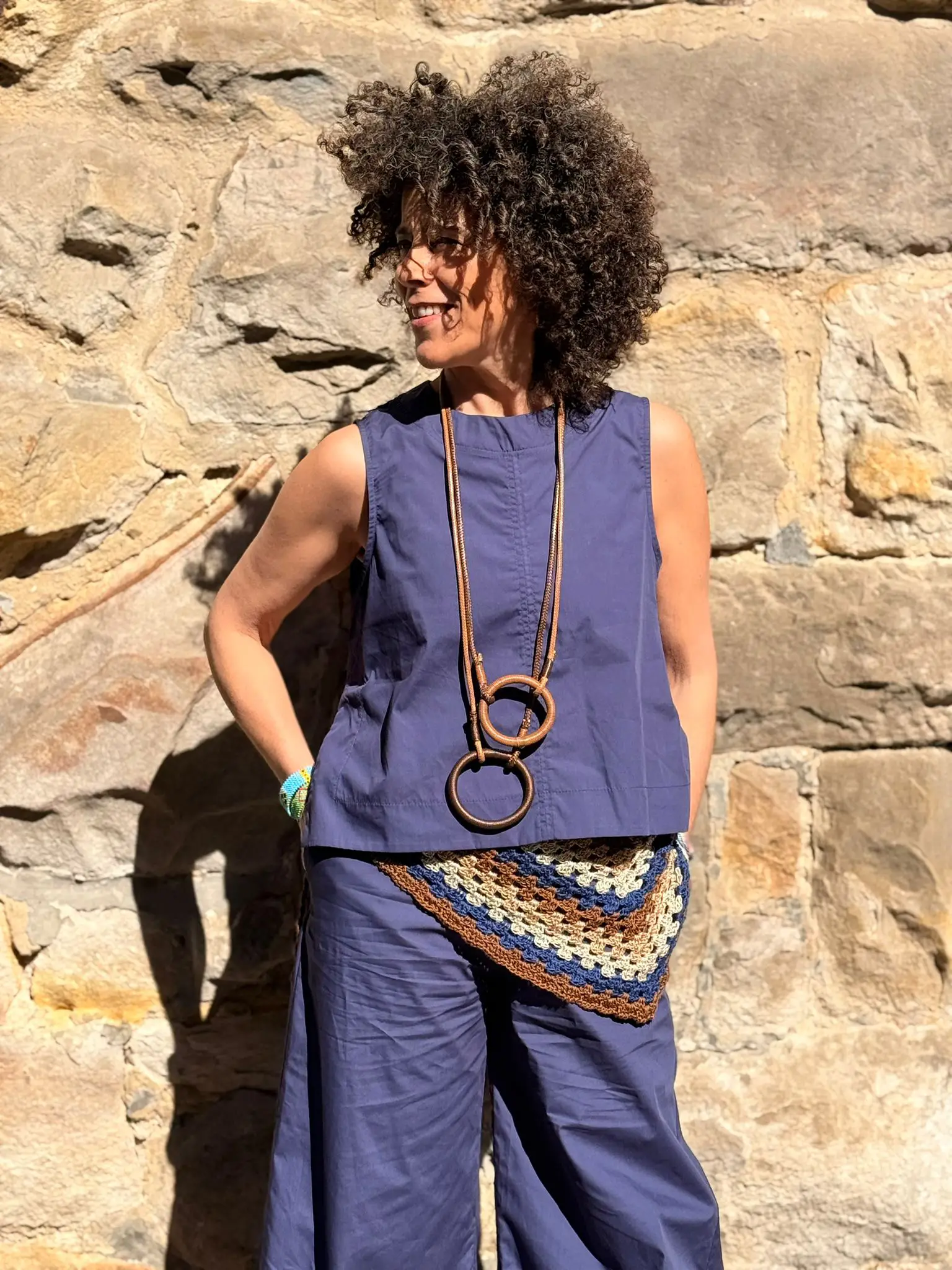 Precioso top sin mangas de escote redondo, diseñado para ofrecer frescura y comodidad en los días más cálidos. Presenta una ligera abertura en los laterales, que aporta movimiento y un aire más desenfadado a la prenda.